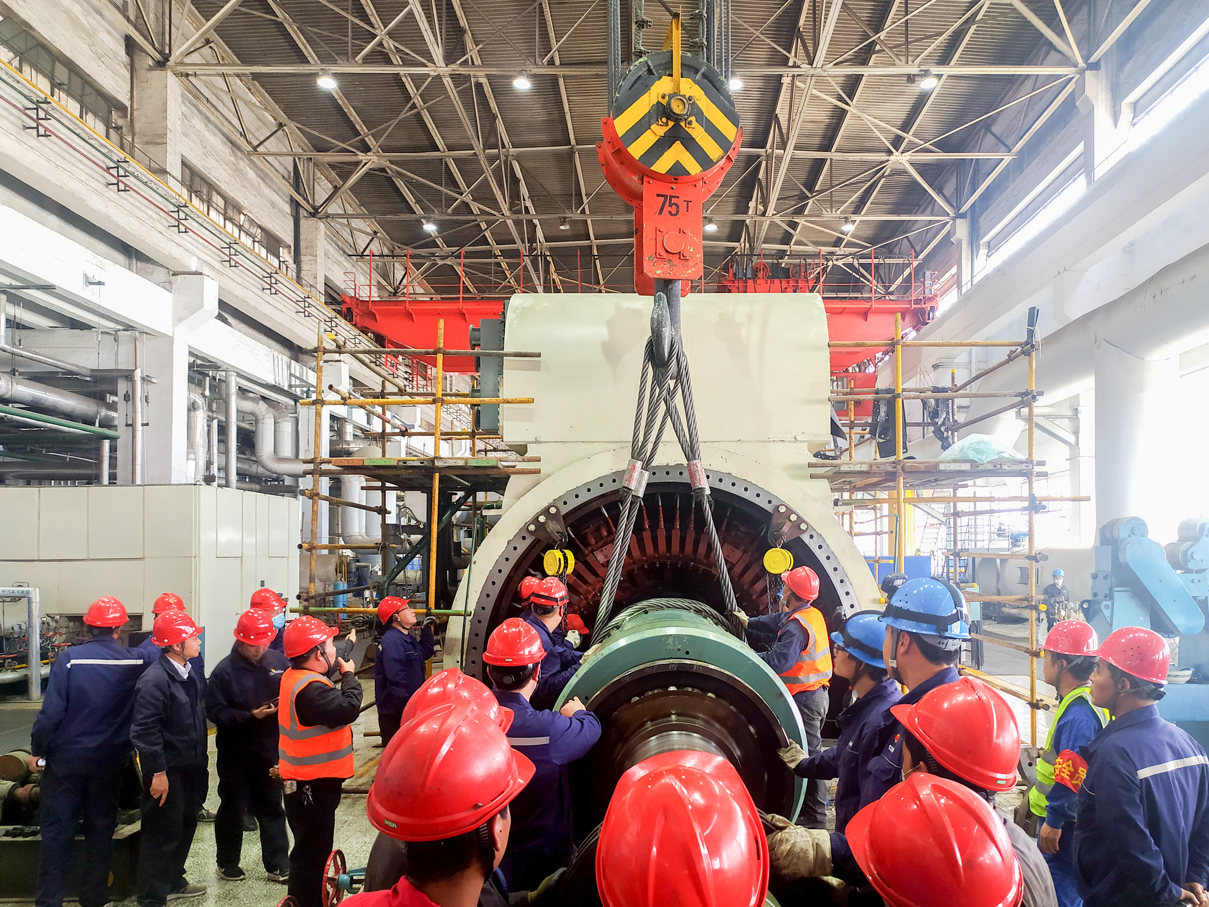 开工前,公司副总经理武红亲临现场,对回穿工作进行指导。渭河项目部精心编制作业指导书,召开安全、技术交底会,明确分工,落实责任,相关专业加班加点完成了膛内异物清理、风区隔板安装等前期工作,为穿装工作提供了可靠保障。经过吊装、平移、牵引等一系列工序后,转子平稳地回到定子线膛内,为后续机组试验、调试创造了有利条件。