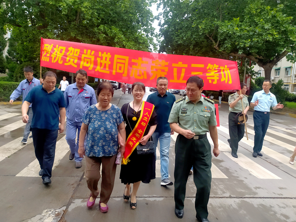 7月23日,咸阳市渭城区武装部一行送来喜报,正阳镇政府、公司渭河项目部等相关单位人员为尚照熙一家送去关怀与祝福,共同见证了这激动人心的一刻。当天上午,咸阳市渭城区武装部一行上门为尚照熙夫妇戴上“一人立功,全家光荣”的鲜红绶带,并送上喜报和慰问金。