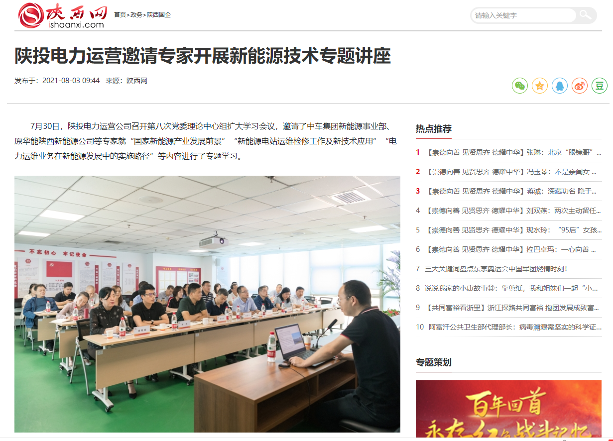 7月30日,公司召开第八次党委理论中心组扩大学习会议,邀请了中车集团新能源事业部、原华能陕西新能源公司等专家就“国家新能源产业发展前景”“新能源电站运维检修工作及新技术应用”“电力运维业务在新能源发展中的实施路径”等内容进行了专题学习。