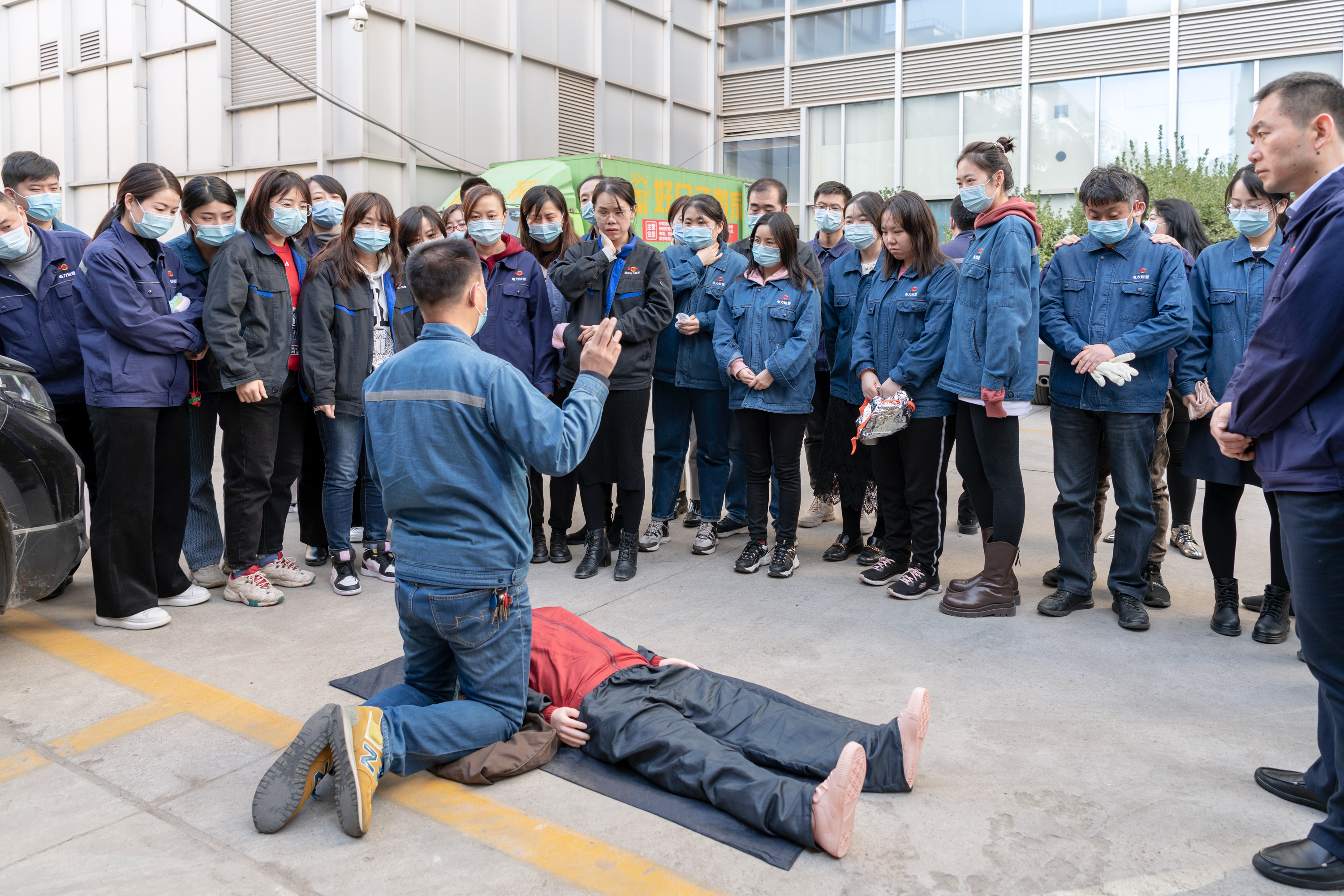 下午15:00,火灾演练预设“22层某办公室电路短路引发火灾”。接到火情报警后,安全监察部立刻通知21、22层各部室员工迅速有序地按规定路线疏散到指定区域。10分钟后,演练人员全部到达指定地点,安全工程师就手提式干粉灭火器、过滤式消防自救呼吸器及CPR心肺复苏法进行了实操演示,并指导参训人员现场操作。