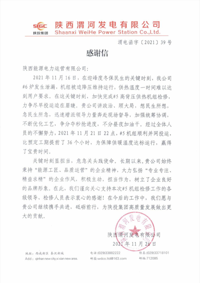 日前,公司分别收到渭河发电、吉木萨尔发电的感谢信、表扬信。