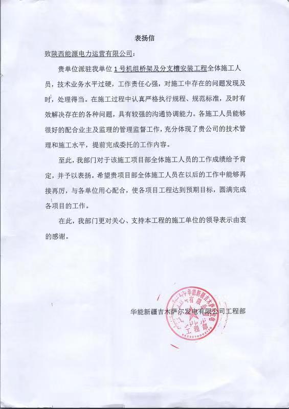在吉木萨尔发电#1机组桥架及分支槽安装工程中,吉木萨尔项目部在现场作业过程中认真执行相关要求,严格落实安全责任,形成项目部团队作战的合力,安全高效地完成了工作任务。项目部过硬的技术水平、组织协调能力及强烈的责任心受到了业主方的高度赞扬。