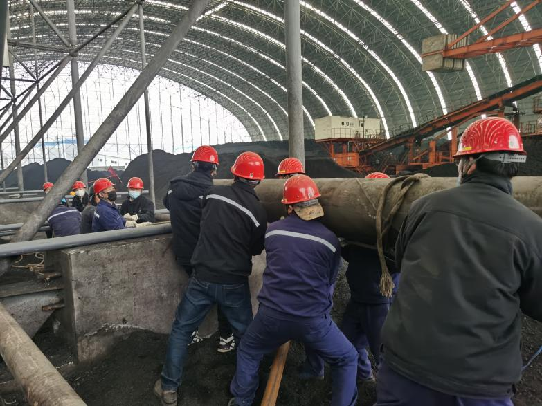 商洛项目部党支部组织开展“战疫保供一线,党旗高高飘扬”煤场排雨母管倒运主题党日活动,助力保电保热。寒冷的煤场里,却是如火如荼的景象,由于煤场内无法使用起吊设施,直径450mm的管道只能靠人力移动、安装至指定位置。大家喊着号子,使出浑身力气,管道也只能微微前进一点。一米、两米……沉重的管道逐步就位。