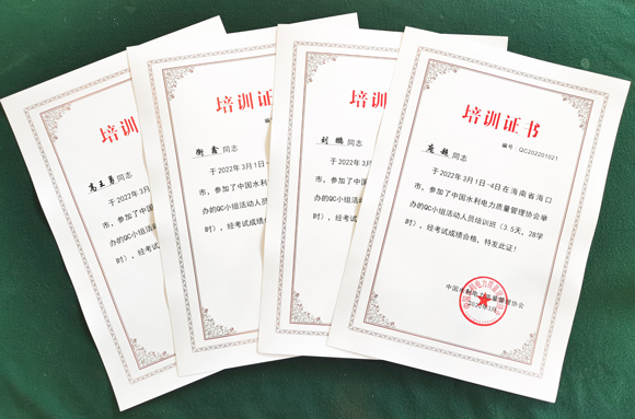 日前,公司组织青年员工参加由中国水利电力质量管理协会举办的2022年质量管理小组活动人员培训,并顺利获取合格证书。
