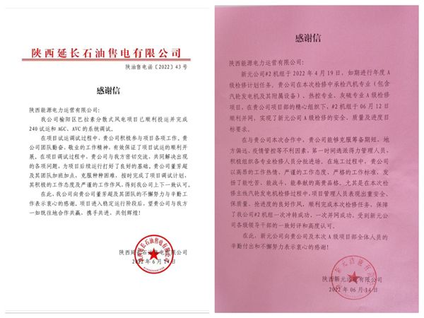 6月14日,陕煤新元洁能、延长售电先后发来感谢信,对公司优质完成#2机组A级检修、巴拉素分散式风电机组240试运和 AGC、AVC 的系统调试项目表示感谢。