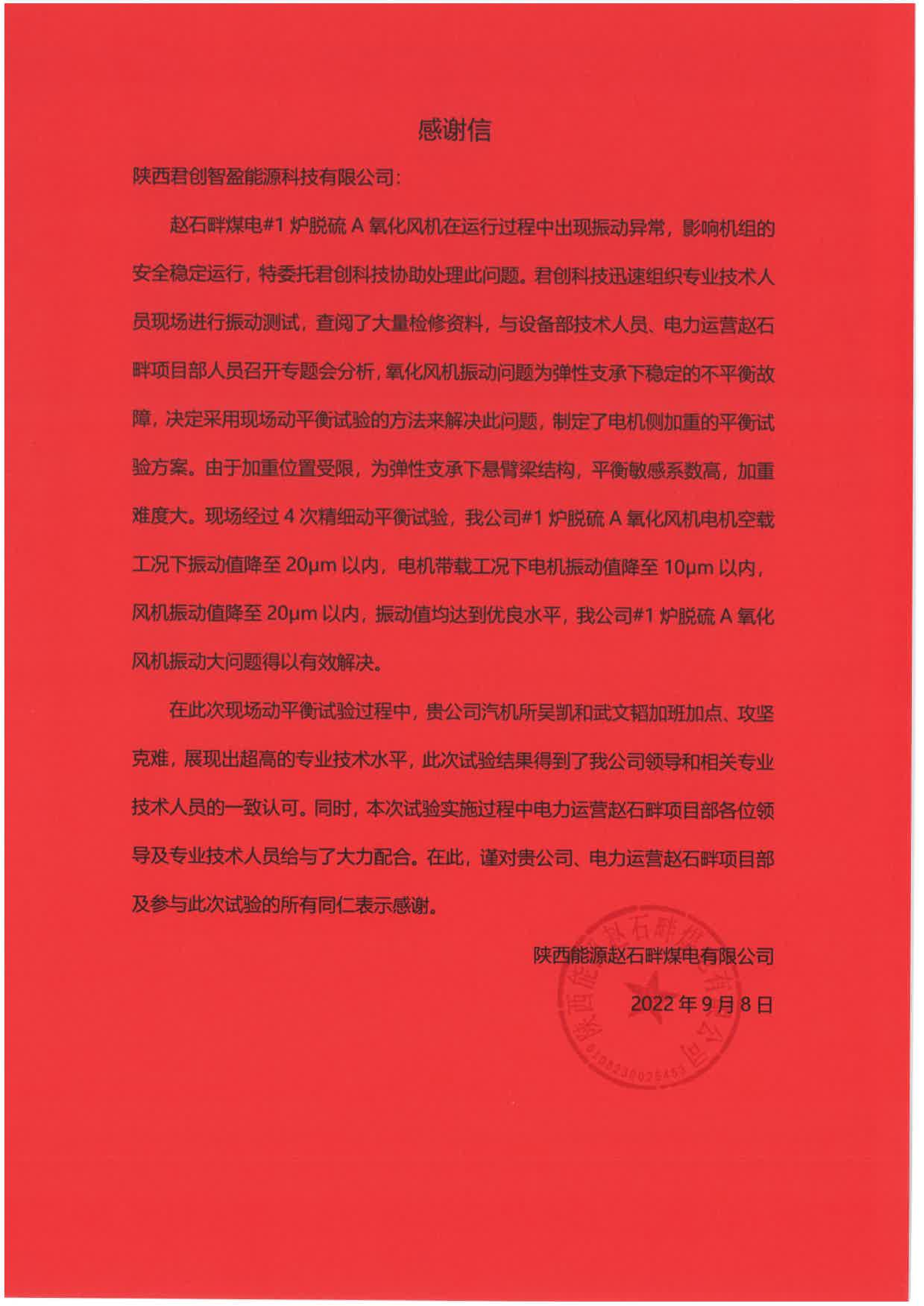 9月9日,赵石畔煤电发来感谢信,对君创科技高质量完成#1炉脱硫A氧化风机动平衡试验表示感谢。