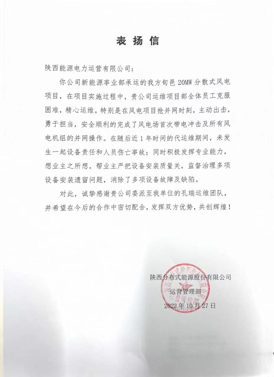 10月27日,公司收到陕西分布式能源公司发来的表扬信,对新能源事业部旬邑风电项目部孔瑞运维团队克服困难,精心运维,在急难险重工作中能主动出击、勇于担当的精神表示高度赞扬。