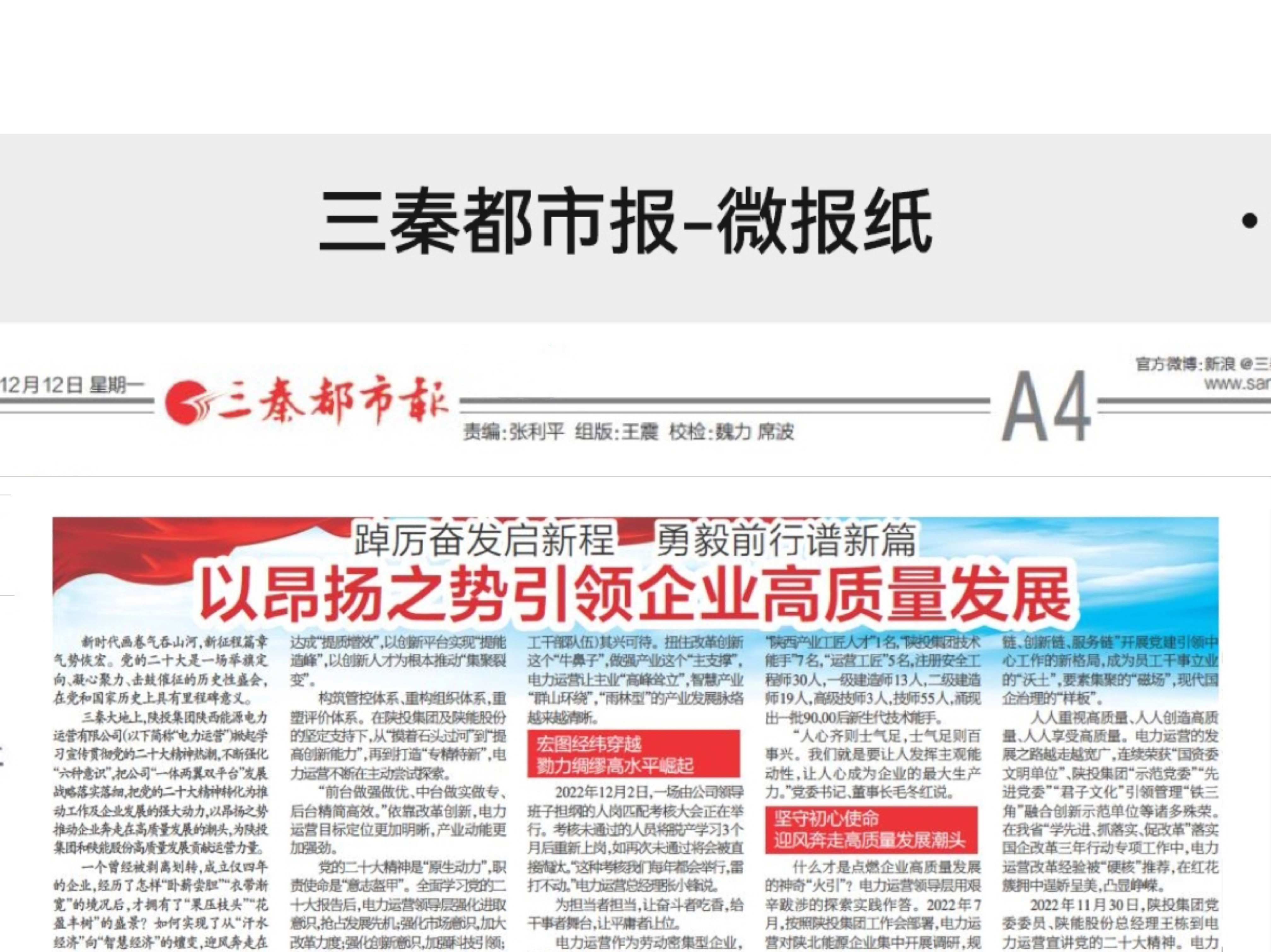 三秦都市报:电力运营 以昂扬之势引领企业高质量发展