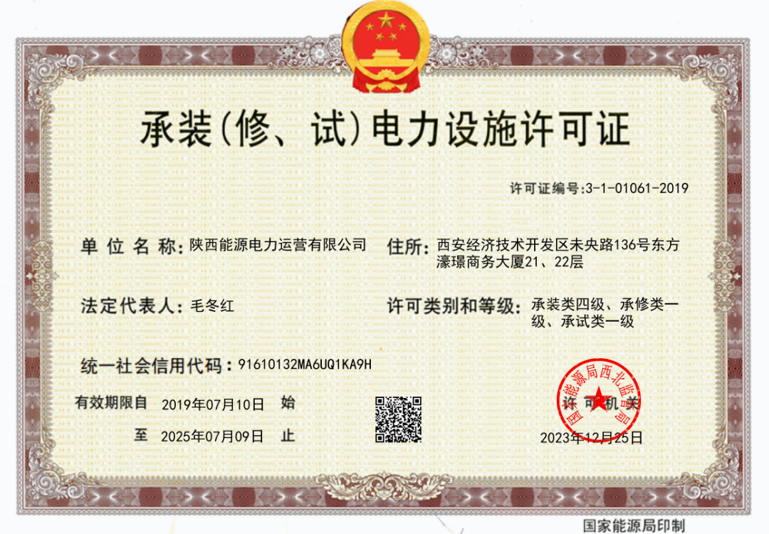 12月25日,公司正式获得国家能源局西北监管局颁发的承修、承试电力设施一级资质许可证,成为陕西省第7家同时拥有该两项资质的企业,公司资质建设取得新突破。