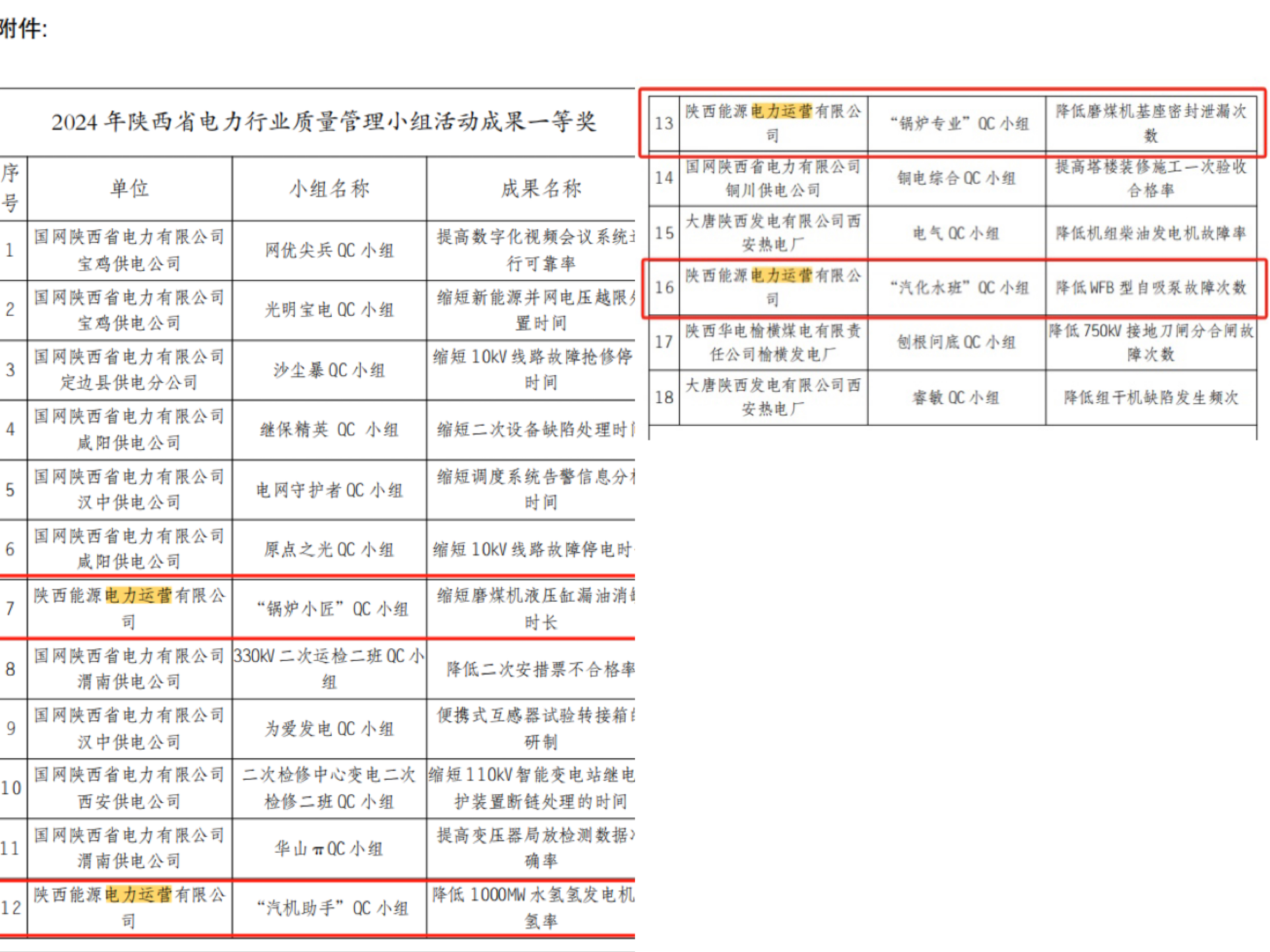 日前,公司《缩短磨煤机液压缸漏油消缺时长》《降低1000MW水氢氢发电机漏氢率》等QC成果荣获陕西省电力行业质量管理小组活动一等奖4个、二等奖1个;君创科技材料专业室荣获省电力行业“质量信得过班组”二等奖,商洛项目部仪电2班、清水川项目部电气2班、麟北项目部汽化水班获三等奖。