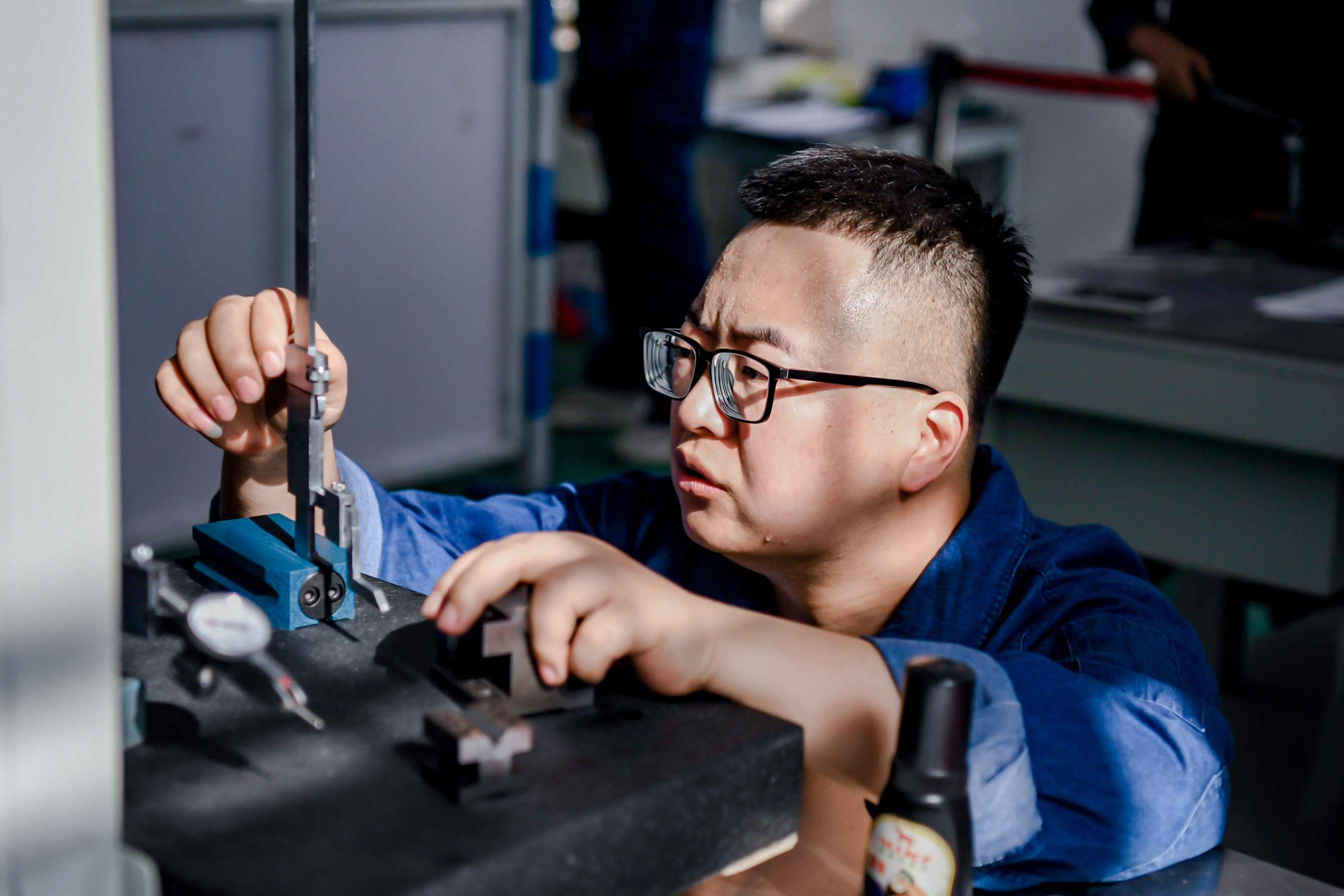 钳工实操赛场,参赛选手或锉削或钻孔或攻螺纹,一板一眼、得心应手。他们要在5个小时内按照图纸要求制作工件,将工件打磨、研修、修整后达到精度要求。“钳工是所有加工技术的基础,包含10多道工艺,所以有着‘万能工种’的说法,要求精度达到0.02毫米,差不多是一根头发丝的三分之一。”现场裁判刘方明感慨地说。