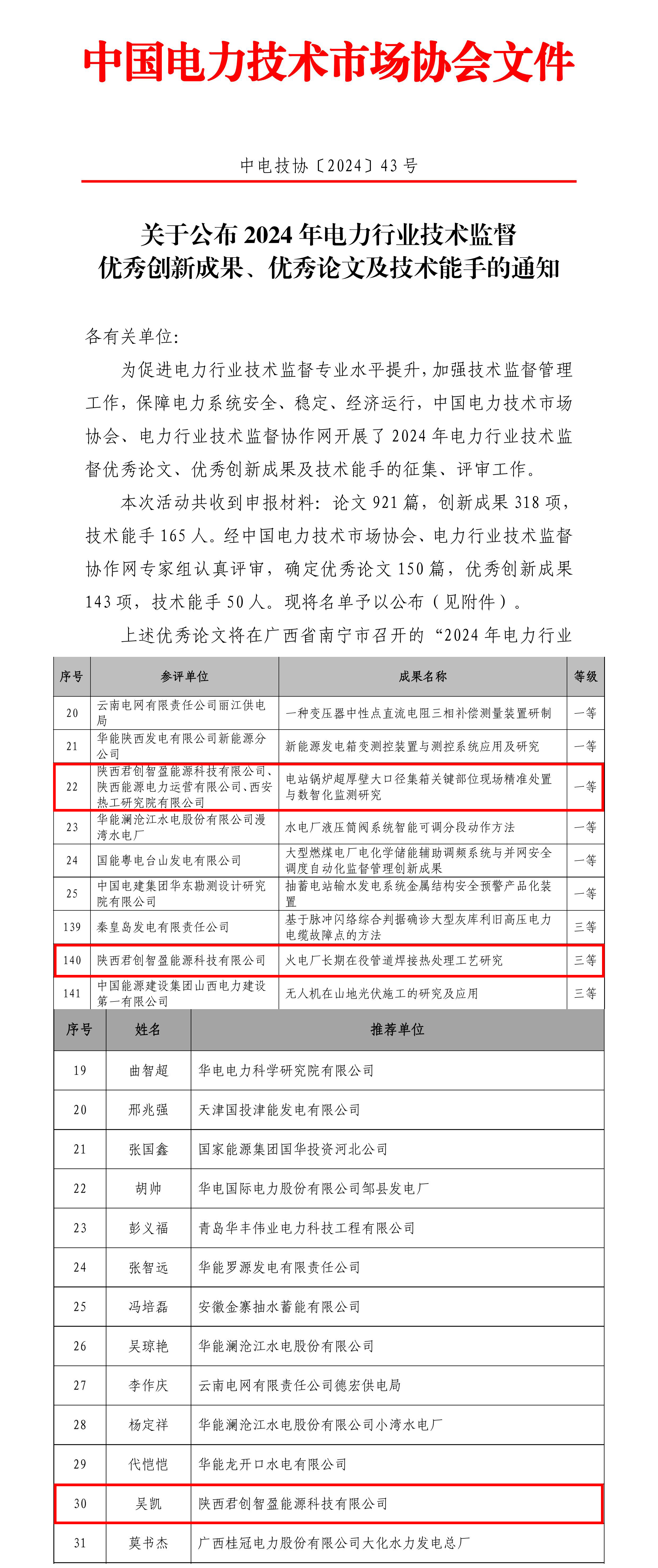日前,君创科技《电站锅炉超厚壁大口径集箱关键部位现场精准处置与数智化监测研究》《火电厂长期在役管道焊接热处理工艺研究》分获中国电力技术市场协会2024年电力行业技术监督优秀创新成果一等奖、三等奖,吴凯获技术能手称号。