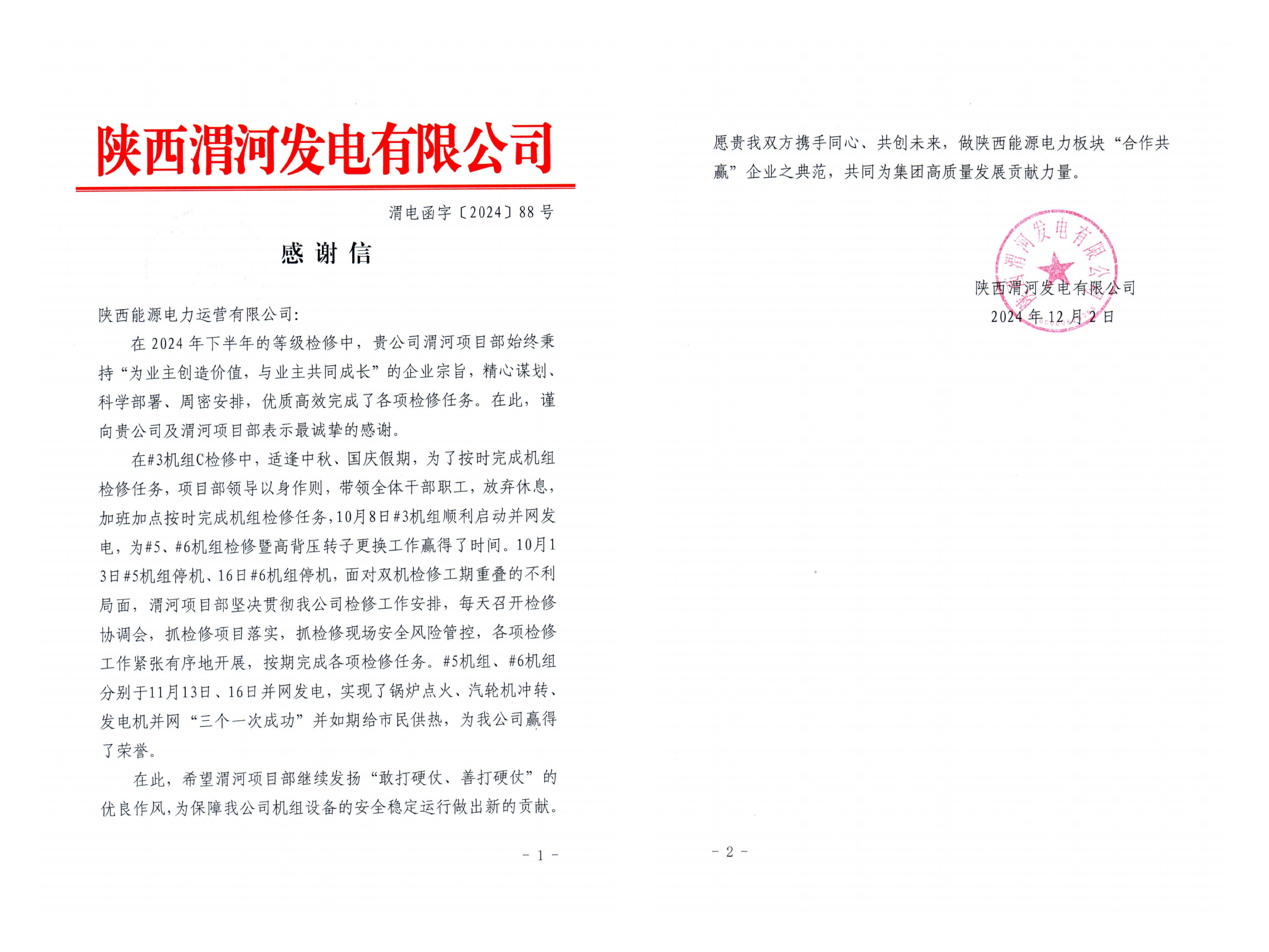 日前,公司收到渭河发电感谢信,对渭河项目部优质高效完成2024年下半年等级检修任务表示感谢。
