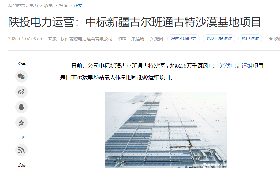 日前,公司中标新疆古尔班通古特沙漠基地52.5万千瓦风电、光伏电站运维项目,是目前承接单场站最大体量的新能源运维项目。