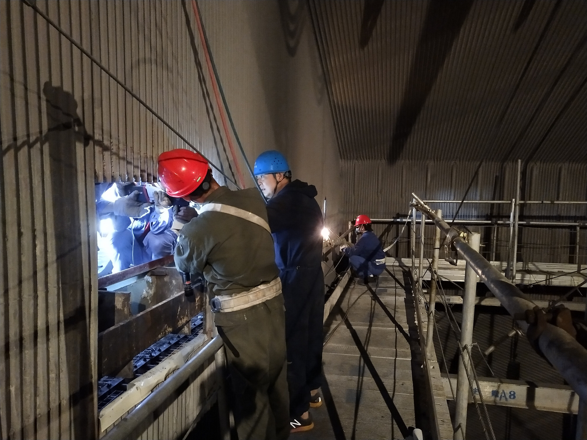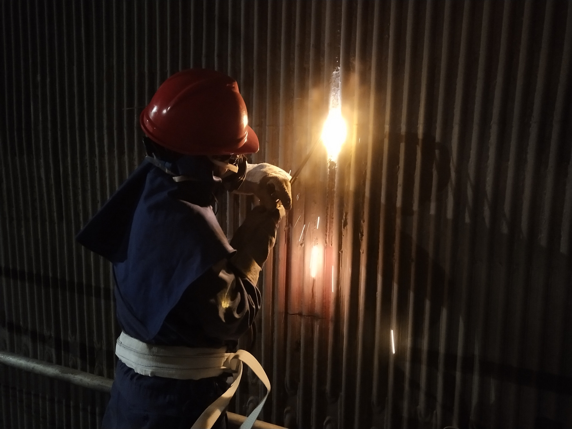 6月7日端午节,在万家团聚的日子,项目部锅炉班开始了#2炉水冷壁66根管道更换的前期准备工作。炉膛内,煤粉、保温渣,夹杂着铁屑飞扬。工作人员站在距地面56米高的脚手架上切除水冷壁管、制水冷壁管坡口、磨鳍片、清除管壁内外锈,各小组有条不紊地开展工作。至6月9日收假前,水冷壁管焊接前准备工作已全部就绪,为节后焊接工作的顺利开展,创造了条件。 (赵 涛 王武军)