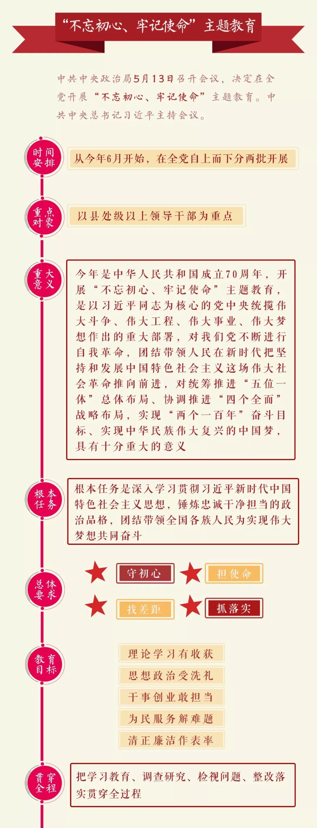 为了便于学习贯彻落实中央会议精神,我公司整理编辑了一图读懂“不忘初心、牢记使命”主题教育,供大家学习参考。
