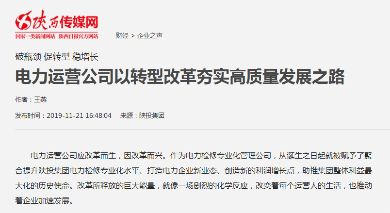 电力运营公司应改革而生,因改革而兴。作为电力检修专业化管理公司,从诞生之日起就被赋予了聚合提升陕投集团电力检修专业化水平、打造电力企业新业态、创造新的利润增长点,助推集团整体利益最大化的历史使命。改革所释放的巨大能量,就像一场剧烈的化学反应,改变着每个运营人的生活,也推动着企业加速发展。