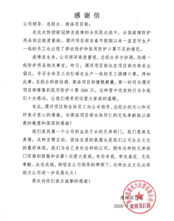 一方有难,八方支援,在渭河项目部疫情防控的最困难时期,作为甲方的渭电有限公司得知情况,立即伸出援手,为渭河项目部送来医用口罩316只。渭电公司副总经理黄卫东说:“渭河项目部与渭电公司本是一家,只因改革成为兄弟单位。我们同居一处,同保生产,共同抗疫,肩负着共同的责任和使命。”