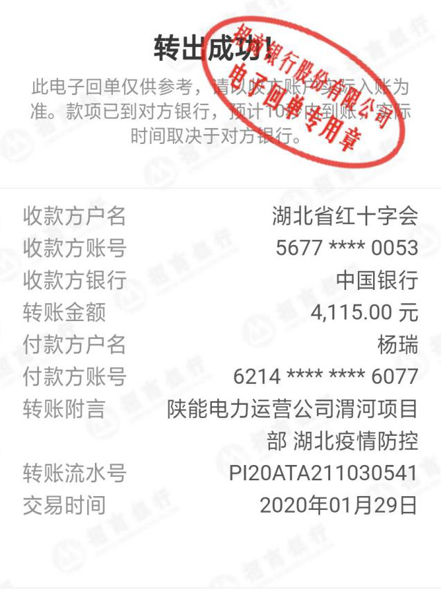 1月29日,一笔4115元的捐款转入湖北省红十字会银行账户,并注明“湖北疫情防控”。这笔来自电力运营渭河项目部的捐款,虽然金额不多,背后却有一段被“借用”的小故事。