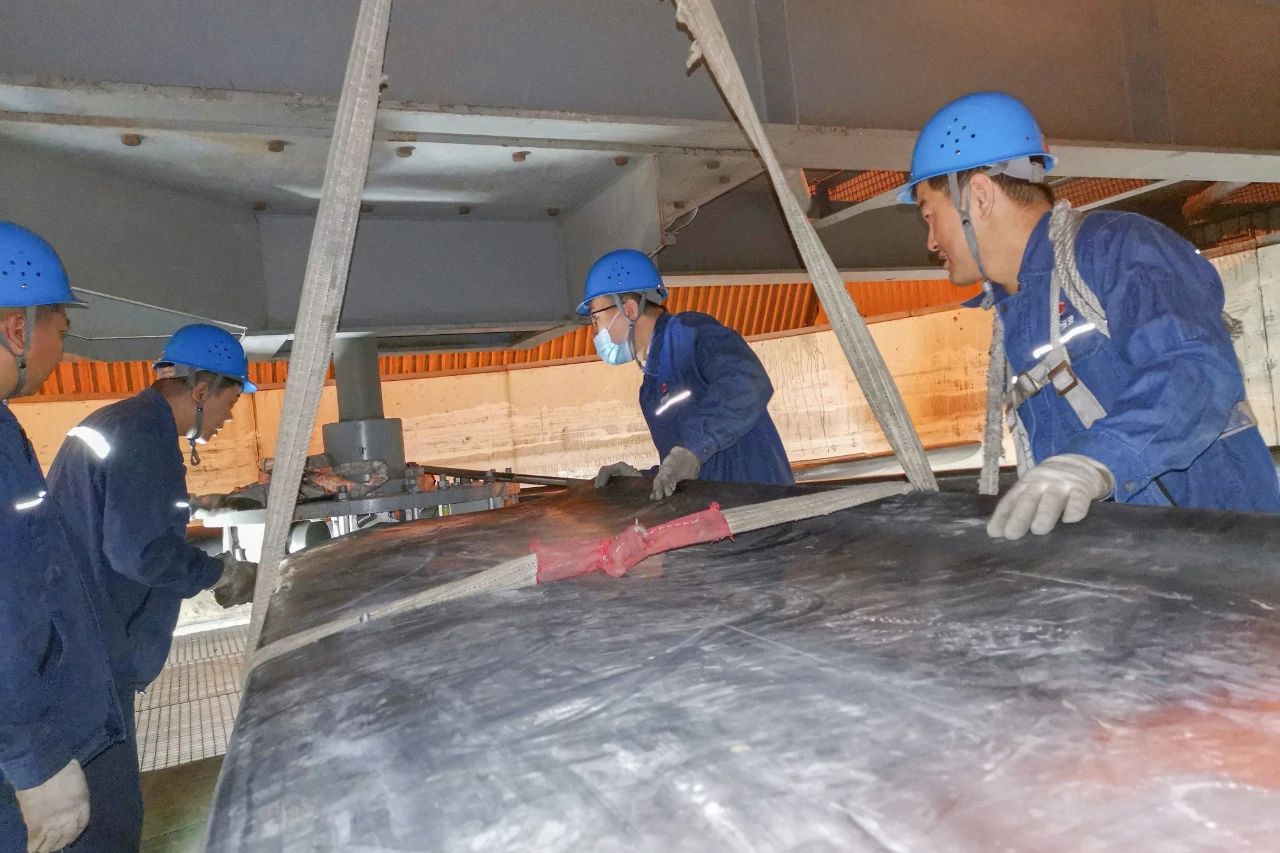 工作现场,需要更换的每根叶片重达500斤,且施工作业面在距离地将近50米的高空,难度可想而知。项目部从各班组抽调的人员紧急支援。在空冷岛风机高分贝噪音的“狂轰滥炸”以及近70℃热浪的“侵袭”下,全体抢修人员加班加点拆卸破损叶片,协调备件,回装叶片,各项工作在有条不紊地进行着。