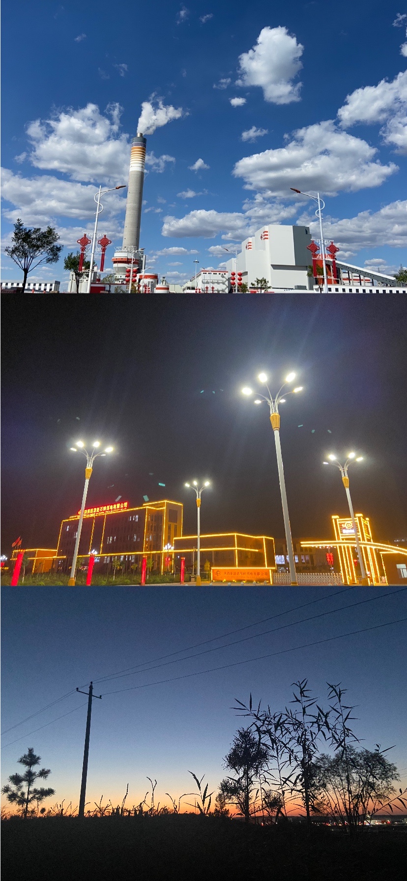 这是做避雷器带电检测和电动工具检测时的赵石畔煤电,人们说的“云淡风轻”便是如此吧。繁星点点与办公楼外的灯带交相辉映,月光下的赵石畔煤电就像是毛乌素沙漠上的一颗明珠。我想,这美好的一切离不开我们项目部人员的辛苦付出吧,是他们点亮了这片夜空。