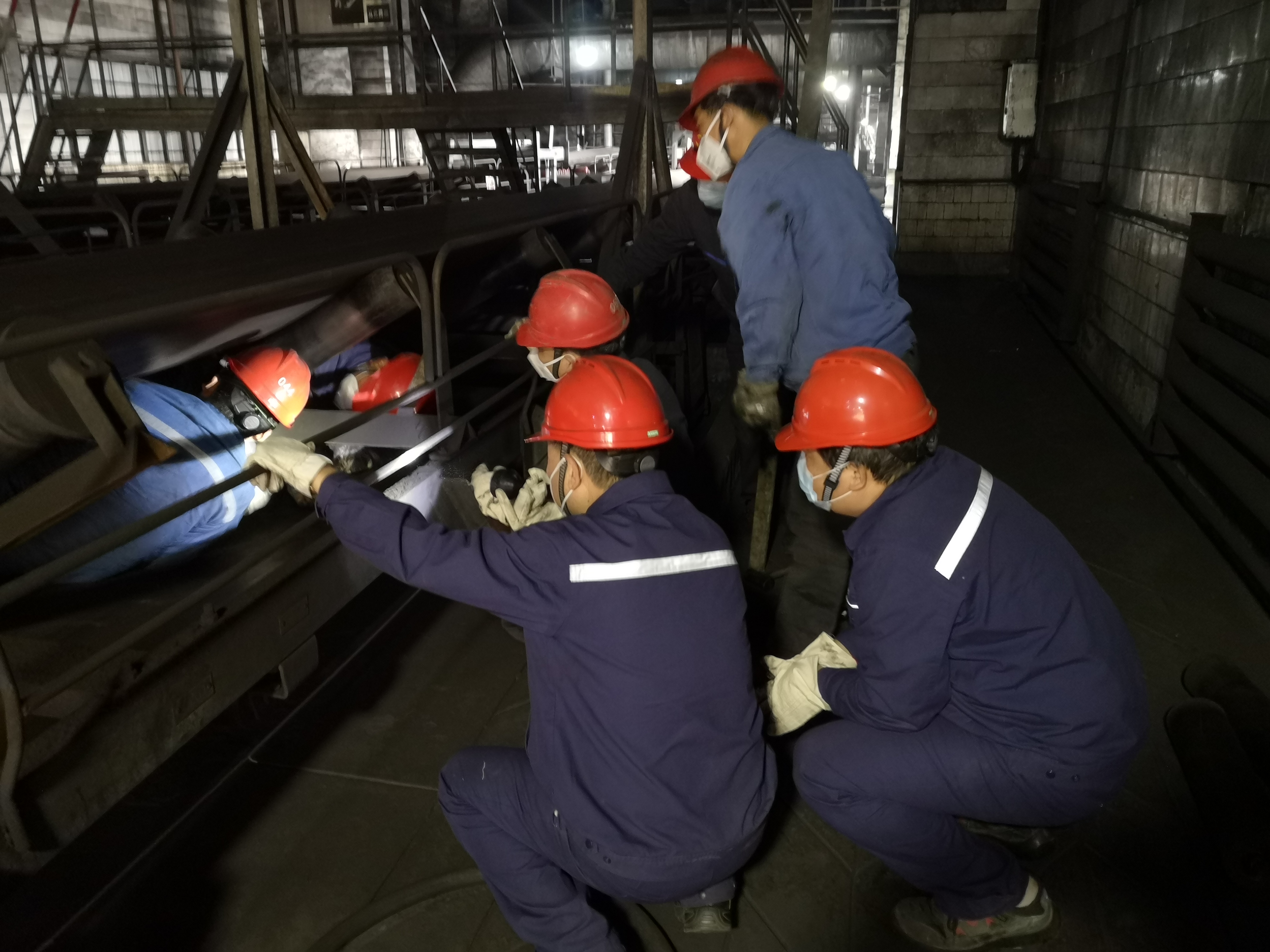 抢修现场,狭窄的空间内,突击队员弓着身子,用背使劲顶起沉重的皮带,使损坏托辊处于无压力状态,再小心地用榔头一下一下敲击槽口将其拆下,然后将新托辊放入槽口。工作中,时常遇到托辊卡死的情况,就需要焊工使用火焊将卡死的托辊割下来,而这一切都需要突击队员在皮带下,或躺、或蜷,以各种“奇特”的姿势进行,工作的难度可想而知。
